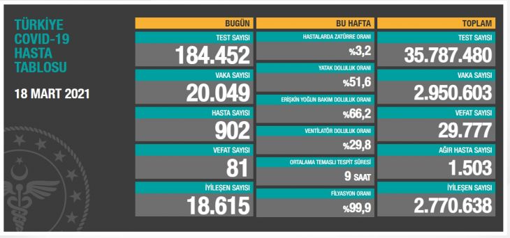 Sağlık Bakanlığının açıkladığı tabloya göre bugünkü vaka sayısı 20.049 olarak gerçekleşmiştir.