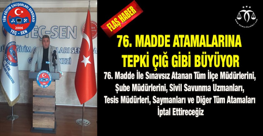 MEB Görevde Yükselme ve Unvan Yönetmeliğinde “SINAV” şartı olan kadrolara 76. Madde kullanılarak “SINAVSIZ” atamalar yapılmaya devam etmektedir. Sınav şartı olmasına rağmen Milli Eğitim Bakanlığınca sınav açılmadan, Sınavsız ataması yapılan İlçe Müdürü, Şube Müdürü, Sivil Savunma Uzmanı, Tesis Müdürü, Sayman v.b. tüm kadroların listesi, sayısı sendikamızca istenmesine rağmen, MEB cevap vermekten kaçınmıştır.