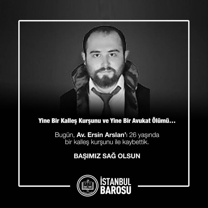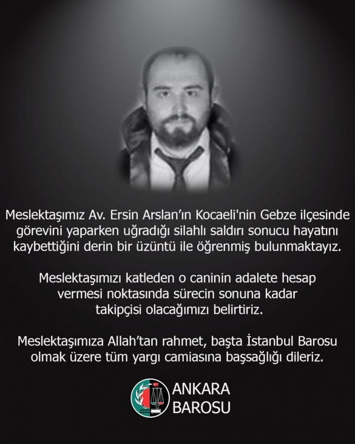 İstanbul Barosu’na kayıtlı meslektaşımız Avukat Ersin Arslan’ın, Kocaeli'nin Gebze ilçesinde haciz işlemi için gittiği evde uğradığı silahlı saldırı sonucu hayatını kaybetmesinden derin üzüntü duyuyoruz.