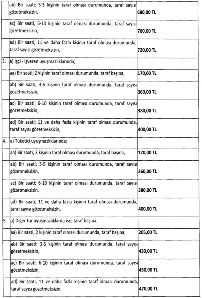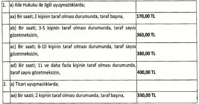 Tarife 1 Ocak 2021 tarihinden itibaren geçerli olacak. Buna göre; aile hukuku, işçi-işveren ve tüketici uyuşmazlıklarında arabulucuya taraf başına saatlik (ilk üç saate kadar) 170 lira olarak ödenecek. Konusu para olmayan veya para ile değerlendirilemeyen uyuşmazlıklar için ise aşağıdaki ücret tarifesi uygulanacak.