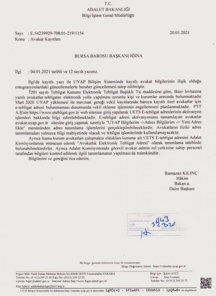 5 Mart UYAP güncellemesi ile E-tebligat adresi olmayan ya da E-tebligat adresi UYAP’a tanımlanmamış avukatların, UYAP’a vekil olarak eklenmesi engellenecek. E-tebligat aktivasyonunun yapılması ve E-Tebligat adresinin UYAP’ta tanımlanması gerekiyor.