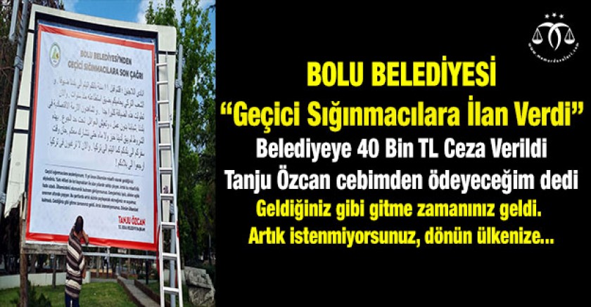 Tanju Özcan’ın isminin yazılı olduğu, ‘Bolu Belediyesi’nden geçici sığınmacılara son çağrı’ başlıklı Türkçe ve Arapça yazılan ilanda, “Geçici sığınmacılara sesleniyorum; 11 yıl önce ülkemize misafir olarak geldiğinizi söylediniz. Türk milleti de kıt kaynakları ile yılardır size sahip çıkıyor. Artık bu misafirlik fazla uzadı. Ülkemizdeki ekonomik buhranı görüyorsunuz. Gençlerimiz işsiz, aileler açlık sınırının altında yaşıyor. Bu şartlarda artık sizinle paylaşacak ekmeğimiz ve suyumuz kalmadı. Geldiğiniz gibi gitme zamanınız geldi. Artık istenmiyorsunuz, dönün ülkenize” ifadelerine yer verildi.