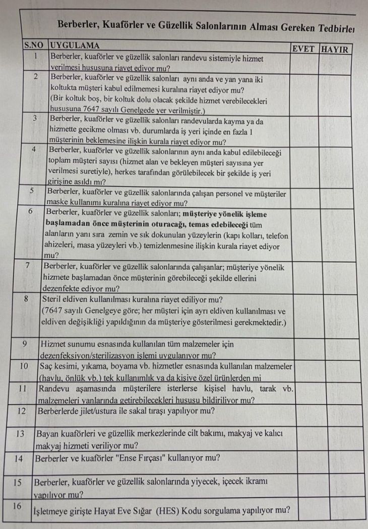 Çünkü kapısından şöyle bir bakıp geçerek; berber müşteri gelmeden önce zemin ve sık dokunulan yerleri veya ellerini her defasından temizliyor mu ya da HES kodu sorgulanıyor mu veya her müşteriye özel havlu-önlük kullanılıyor mu tespit edilemez.