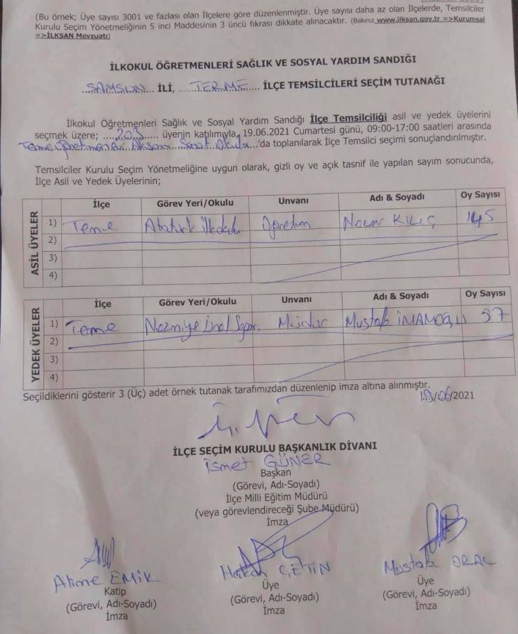 Türk Eğitim Sen Genel Başkan Yardımcısı M. Yaşar Şahindoğan sosyal medya hesaplarında bugün Samsun ili Terme ilçesine ait İLKSAN Seçim tutanağını yayınladı.
