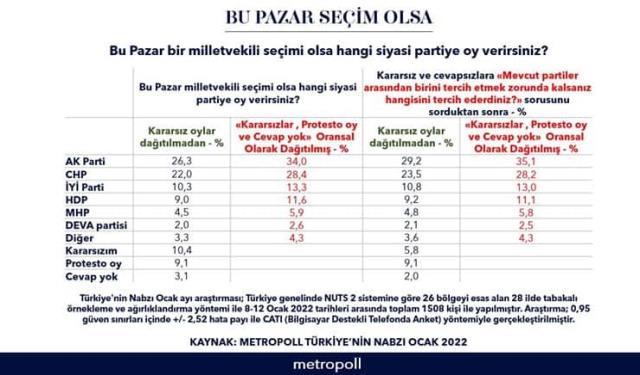 MetroPOLL Araştırma şirketinin 8-12 Ocak tarihlerinde 28 kentten 1508 kişiyle telefonda görüşerek hazırladığı anketin sonuçları açıklandı.