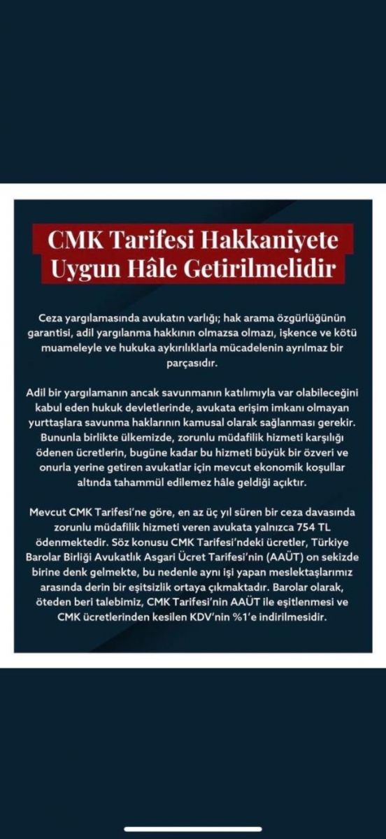 Türkiye Barolar Birliği ile Adalet Bakanlığı arasında yeni dönem CMK Ücret Tarifesi'nin belirlenmesine yönelik görüşmelerin sürdürülmekte olduğunu biliyor, bu görüşmeleri önemsiyoruz. Avukatlık mesleğinin onuruyla bağdaşan, meslektaşlarımızın emeklerine karşılık gelen ve adil yargılanma hakkına erişimi sağlayan hakkaniyete uygun bir artışın bu görüşmeler sonucunda ortaya çıkmasını bekliyoruz. Şu aşamada, Barolarla aynı hassasiyeti gözeten Türkiye Barolar Birliğinden beklentimiz, ÜT'de olduğu gibi CMK Tarifesi görüşmelerinde de meslektaşlarımızın talepleri doğrultusunda bir sonuç elde etmek üzere konunun tüm muhataplarıyla etkin bir müzakere süreci yürütmesidir.