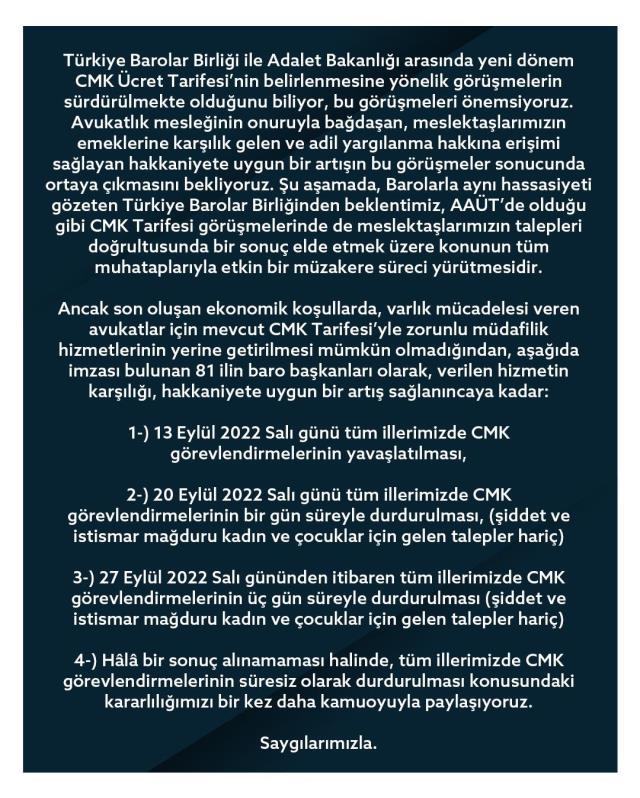 Ancak son oluşan ekonomik koşullarda, varlık mücadelesi veren avukatlar için mevcut CMK Tarifesi'yle zorunlu müdafilik hizmetlerinin yerine getirilmesi mümkün olmadığından, aşağıda imzası bulunan 81 ilin baro başkanları olarak, verilen hizmetin karşılığı, hakkaniyete uygun bir artış sağlanıncaya kadar: