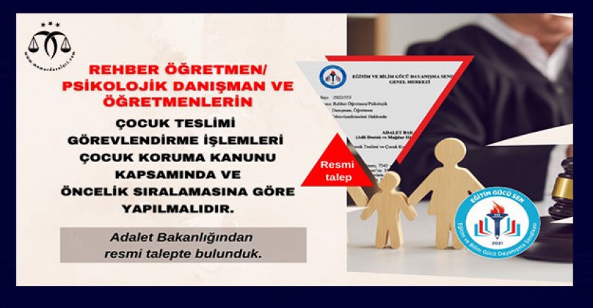 Eğitim Gücü Sen olarak Anayasanın memurlar ve diğer kamu görevlilerinin nitelikleri, atanmaları, görev ve yetkileri, hak ve yükümlülükleri, aylık ve ödenekleri ile diğer özlük işlerinin kanunla düzenleneceğine dair 128. maddesi hükmünün yanı sıra, Çocuk Koruma Kanunu’na eklenen 41/A maddesinin uygulanmasını gösteren bir Yönetmelik hükmünün de henüz yürürlüğe girmediği dikkate alındığında, uygulamanın Kanunun çizdiği çerçeve ve öncelik sıralaması doğrultusunda yapılması adına, Adli Destek ve Mağdur Hizmetleri Müdürlükleri ile ilgili yazışmaların yapılması dâhil gerekli tüm işlemlerin tesisini ve bu konuda Sendikamıza yazılı olarak bilgi verilmesini talep ettik.