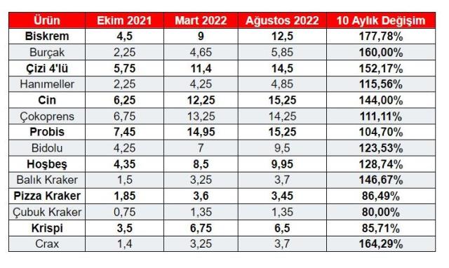 Sözcü'de yer alan habere göre; Cumhurbaşkanı Erdoğan'ın geçtiğimiz yıl market alışverişi sırasında, bisküvi, gofret ve kraker ürünlerinin yer aldığı reyonun önünde çekilen bir fotoğrafından yola çıkarak söz konusu ürünlerdeki son 10 aydaki fiyat hareketliliğini mercek altına alındı. Buna göre reyondaki ürünlerin fiyatlarının 10 ayda 3 kat arttığı belirlendi.