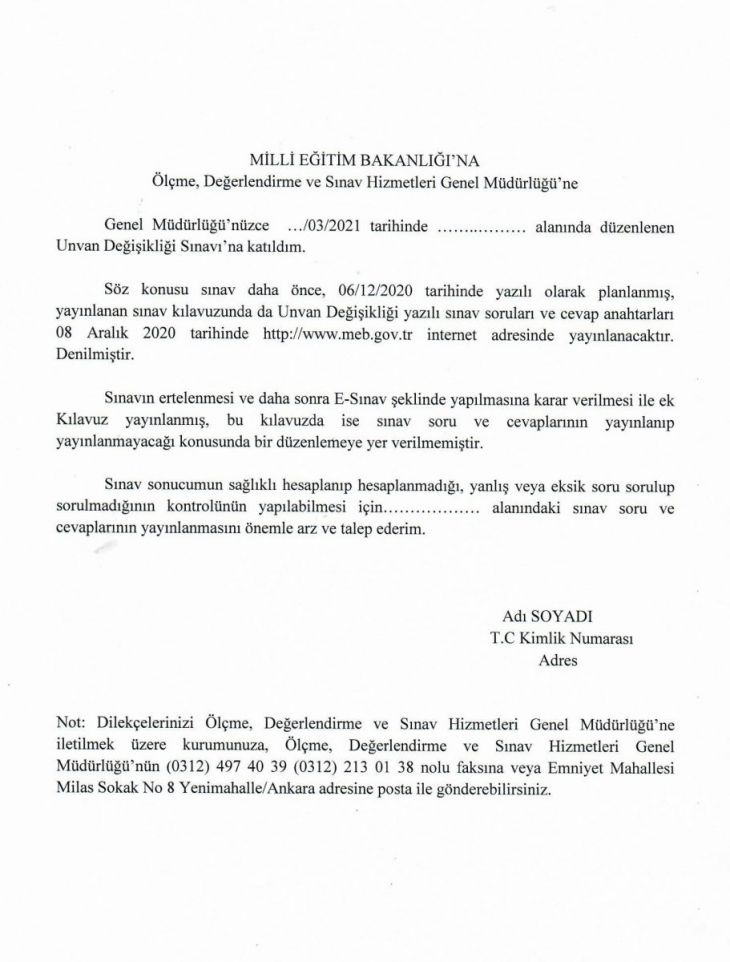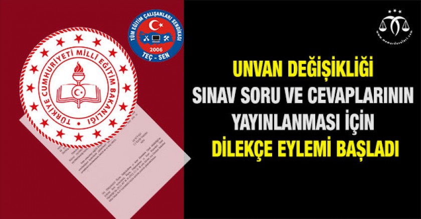 Bu nedenle; TEÇ-SEN Ölçme, Değerlendirme ve Sınav Hizmetleri Genel Müdürlüğü’nden, Unvan değişikliği Sınavının soru ve cevaplarının bir an önce yayınlanmasını istemiş konu ile ilgili olarak dilekçe eylemi başlatmıştır.