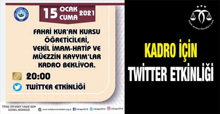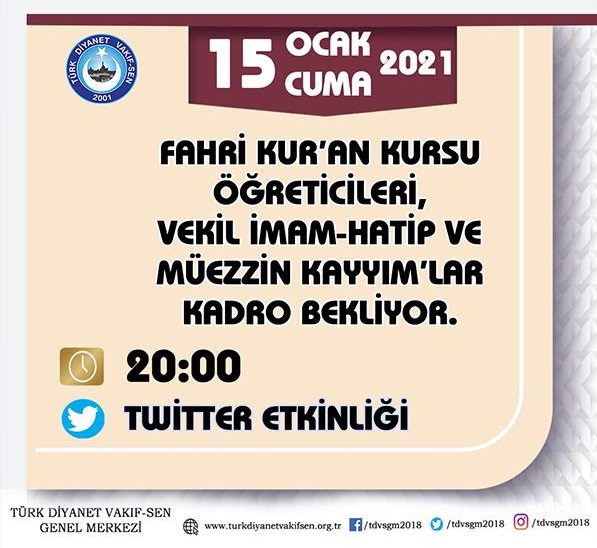 Fahri Kur’an Kursu Öğreticileri, Vekil İmam-Hatip ve Müezzin-Kayyım’ların kadro talepleriyle ilgili twitter gündem etkinliğimiz 15 Ocak Cuma saat 20.00’de Genel Başkanımız @nuri_nuriunal ‘ın atacağı ilk tweeti ile başlayacaktır.