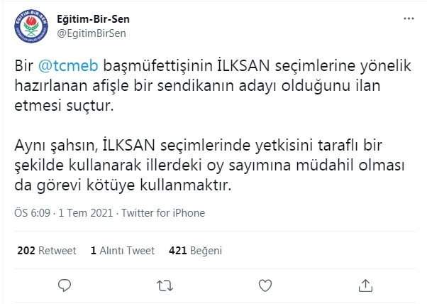Eğitim Bir Sen twitter adresi üzerinden yaptığı açıklama da Türk Eğitim Sen lehine aday olan müfettiş için Milli Eğitim Bakanlığına çağrıda bulunarak işlenen suçtur gereğini yapın dedi. Konu hakkında acaba öğretmenlerimiz ne düşünüyor? İşte Eğitim Bir Sen’in o paylaşımları: