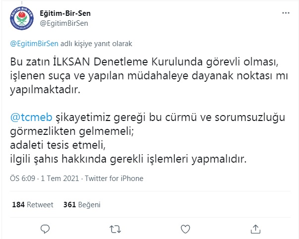 Bu zatın İLKSAN Denetleme Kurulunda görevli olması, işlenen suça ve yapılan müdahaleye dayanak noktası mı yapılmaktadır. @tcmeb şikâyetimiz gereği bu cürmü ve sorumsuzluğu görmezlikten gelmemeli; adaleti tesis etmeli, ilgili şahıs hakkında gerekli işlemleri yapmalıdır.