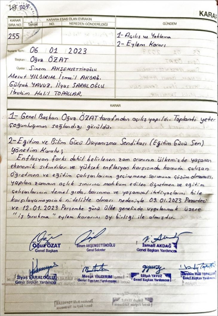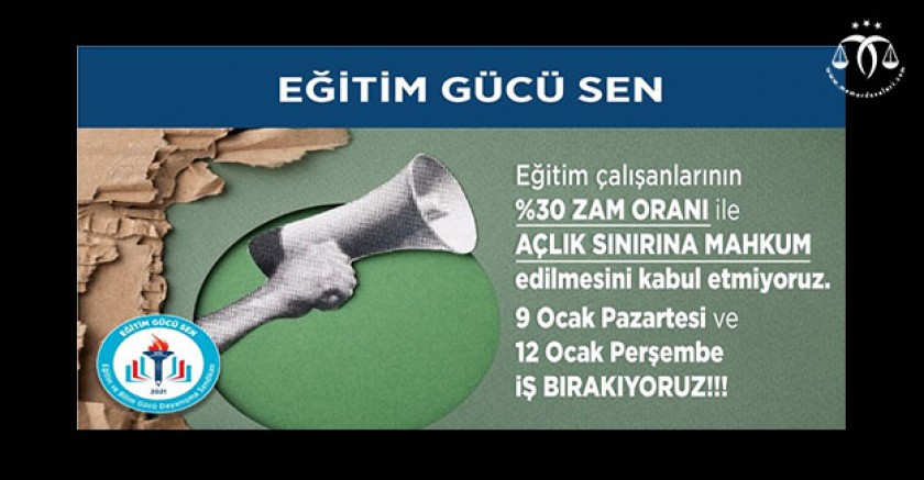 Bu ekonomik koşullar içinde eğitim çalışanlarının maaşlarına %30 zam demek, eğitim çalışanlarını açlık sınırına mahkum etmektir. Eğitim çalışanlarının her türlü sorunda olduğu gibi ekonomik problemlerinin çözümü için de gerek sahada gerekse hukuki boyutlarda gereğini yapmaya çalışan Eğitim Gücü Sen Yönetim Kurulu; enflasyon farkı dahil belirlenen zam oranının ülkemizde yaşanan ekonomik sıkıntılar ve yüksek enflasyon karşısında kamuda çalışan eğitim çalışanlarının geçinememe sorununa çözüm olmaması, yapılan zammın açlık sınırına mahkum edilen eğitim çalışanlarının temel gıda, barınma ve yaşamsal ihtiyaçlarını bile karşılayamayacak nitelikte olması nedeniyle 09.01.2023 Pazartesi ve 12.01.2023 Perşembe günü ülke genelinde uygulanmak üzere “iş bırakma” eylem kararını oy birliği almıştır.