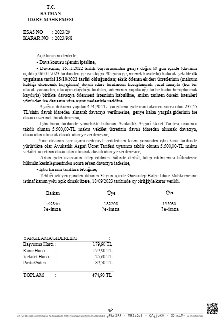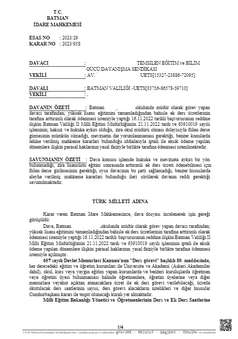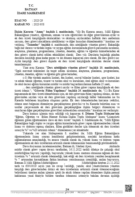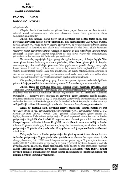 Batman İdare Mahkemesi 2023/958 sayılı kararında “Bu durumda, yaptığı işin doğası gereği ders görevi olmayan, bir başka deyişle fiilen derse girme imkanı bulunmayan davacı yönünden; fiilen derse girme gibi bir koşulun aranamayacağı, okul müdürlüğü görevinin fiilen yapılmasının yeterli olacağı, dolayısıyla lisans sonrası kendilerini geliştirmeleri, mesleki hayatlarına katkı sağlayabilmeleri adına yüksek lisans/doktora yapmış olan okul müdürlerine de ayrım gözetilmeksizin artırımlı ek ders ücreti ödemesi gerektiği sonuç ve kanaatine varılmakla, aksi yönde tesis edilen dava konusu işlemde hukuka ve mevzuat hükümlerine uyarlık bulunmamaktadır.” İfadelerine yer vererek yüksek lisans ve doktora yapmış olan idarecilerin de ek dersinin artırımlı ödenmesi gerektiğine karar verdi.