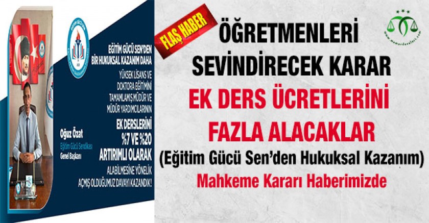 Eğitim Gücü Sendikası Genel Başkanı Oğuz ÖZAT; “Geçmişte Psikolojik Danışmanlar için kazandığımız yüksek lisans ve doktora eğitiminden kaynaklı ek ders ücretinin artırımlı ödenmesi kararını, kurum yöneticileri içinde kazanmış bulunuyoruz. Bu zamana kadar ödenmeyen bu ek ders artırım hakkını artık idarecilerimiz de alabilecektir. Bu emsal bir karardır. Bu hukuki kazanımla gerekli mevzuat değişikliklerinin yapılması için Bakanlığa resmi yazımızı da yazıyoruz. Sürecin takipçisi olacağız. Eğitim ve Bilim Gücü Dayanışma Sendikası Milli Eğitim personelinin haklı taleplerini her zaman savunmaya ve bu konularda hukuk mücadelesi vermeye devam edecektir.” Dedi.