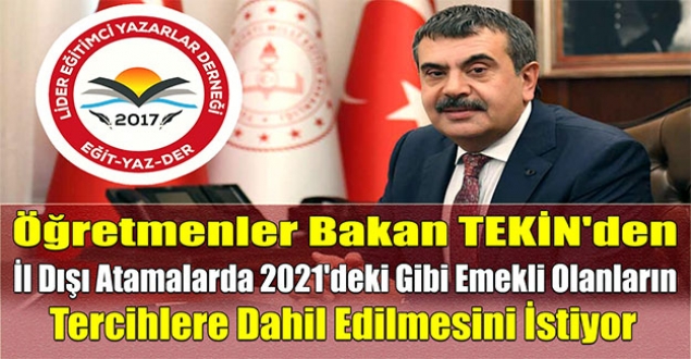 Aslında Sayın Yusuf Tekin’in Milli Eğitim Bakanı olmasıyla birlikte yakalanan olumlu hava, 2021 yılında yapılan bu güzel uygulamanın bu sene de devam ettirilerek temmuz ayında emekli olan öğretmenlerin il dışı atamada kontenjanlara yansıtılması ile daha da artarak gelişmesini sağlayacaktır. Bu adıma hem Milli Eğitim Bakanlığının hem de öğretmen camiasının ihtiyacı bulunmaktadır.