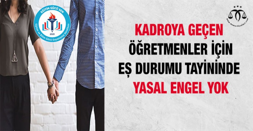 Eğitim ve Bilim Gücü Dayanışma Sendikası; kadroya geçen öğretmenler için eş durumu tayininde yasal engel yok, açıklaması yaptı. Eğitim Gücü Sen sözleşmeliden kadroya geçen üyelerinin mağduriyet yaşamaması için bir dilekçe ile kadrolu memurların yer değiştirmeye bağlı tüm haklarını talep etmelerini istedi. Dilekçenin olumsuz yanıtlanması durumunda ise dava yolunun açılacağını bildirdi.