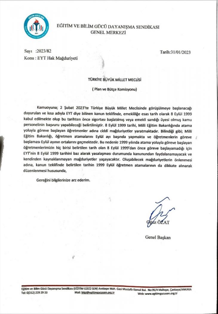 Bilindiği gibi; Milli Eğitim Bakanlığı, öğretmen atamalarını Eylül ayı başında yapmakta ve öğretmenlerin göreve başlaması Eylül ayının ortalarını geçmektedir. Bu nedenle 1999 yılında atama yoluyla göreve başlayan öğretmenlerimizin hiç birisi belirtilen tarih olan 8 Eylül 1999’dan önce göreve başlayamadığı için EYT’nin 8 Eylül 1999 tarihini baz alarak yasalaşması durumunda kanunundan faydalanamayacak ve kendinden kaynaklanmayan mağduriyetler yaşayacaktır. Oluşabilecek mağduriyetlerin önlenmesi adına, kanun teklifinde belirtilen tarihin 1999 Eylül öğretmen atamalarının da dikkate alınarak düzenlenmesi hususunda TBMM Plan ve Bütçe Komisyonundan resmi talepte bulunduk.