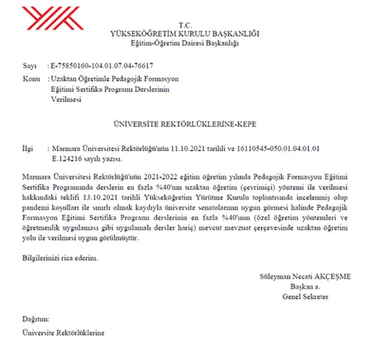 Yükseköğretim Kurulu Başkanlığı tarafından bu konuya dair üniversitelere gönderilen yazıda; pandemi koşulları ile sınırlı olmak kaydıyla üniversite senatolarının uygun görmesi halinde Pedagojik Sertifika Programı derslerinin Formasyon Eğitimi en fazla %40'ının (özel öğretim yöntemleri ve öğretmenlik uygulaması gibi uygulamalı dersler hariç) mevcut mevzuat çerçevesinde uzaktan öğretim yolu ile verilmesi uygun görüldüğü ifade edilmiştir.