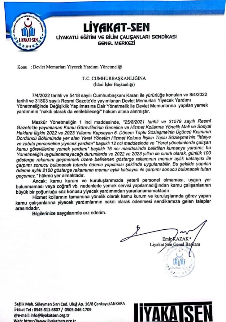7/4/2022 tarihli ve 5418 sayılı Cumhurbaşkanı Kararı ile yürürlüğe konulan ve 8/4/2022 tarihli ve 31803 sayılı Resmi Gazete'de yayımlanan Devlet Memurları Yiyecek Yardımı Yönetmeliğinde Değişiklik Yapılmasına Dair Yönetmelik ile Devlet Memurlarına yapılan yemek yardımının "nakdi olarak da verilebileceği" hüküm altına alınmıştır.