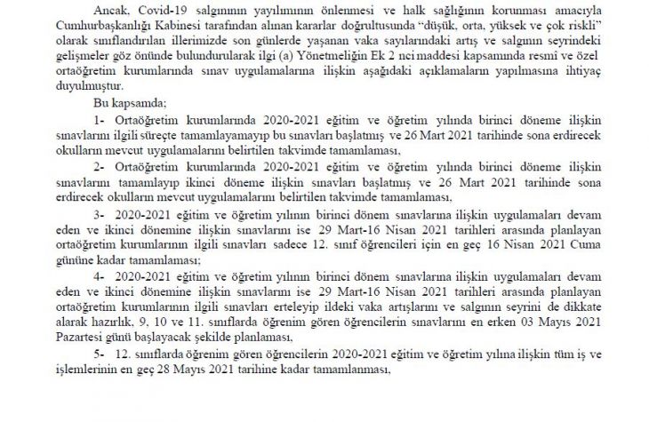 Ara sınıflar 9-10 ve 11. sınıflarda sınavlar 3 Mayıstan önce başlamayacak. Bu kararın alınmasında Mutant virüs nedeniyle illerdeki vaka sayılarında görülen ani artışların etkili olduğu ifade edildi.