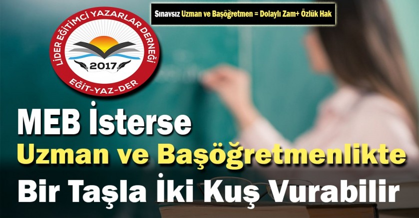MEB bu durumda, uzman öğretmenlik ve başöğretmenlik konusunda sınav şartını kaldırırsa öğretmenlerin hem zam beklentisini normal enflasyon farkına ilaveten dolaylı olarak bir nebze karşılamış olur hem de uzman öğretmenlik ve başöğretmenliği sadece öğretmen oldukları için vererek yapılmak istenen gibi öğretmenlerin kalbini de kazanıp hak ettiği itibarlarını da vermiş olur. Nitekim bu hareket ile “MEB Uzman ve Başöğretmenlikte Bir Taşla İki Kuş Vurmuş” olur.