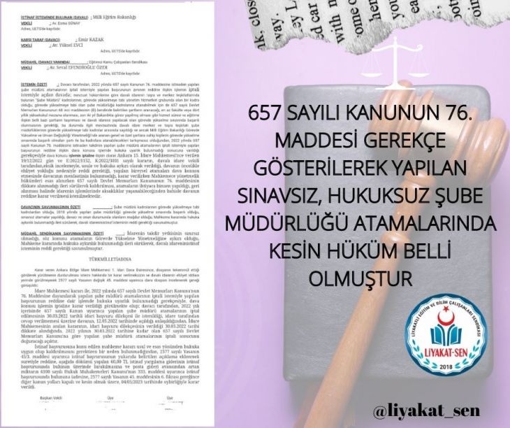 Bilindiği üzere MEB 2022 yılında Görevde Yükselme Yönetmeliğine tabi kadro olan Şube Müdürlüğü kadrolarına; 657 Sayılı DMK'nın 76. Maddesini gerekçe gösterip inisiyatife dayalı olarak merkez ve taşra teşkilatlarına yüzlerce şube müdürü atamıştır.