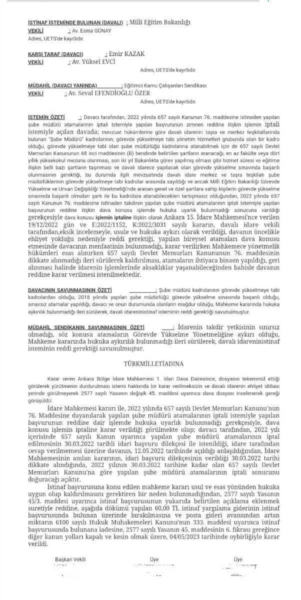 Bunun üzerine MEB, Ankara 15. İdare Mahkemesinin iptal kararına itiraz ederek (YD talepli ) iptali için Ankara 1. Bölge İdare Mahkemesine başvurmuştu. Bu süreçte biz de MEB'in hem 2021 hem de 2023 yıllarında 657 Sayılı DMK'nın 76. Maddesi gerekçe gösterilerek yaptığı sınavsız atamaların iptali için (yürütme durdurma talepli) olarak Ankara 9. İdare Mahkemesine dava açmıştık.