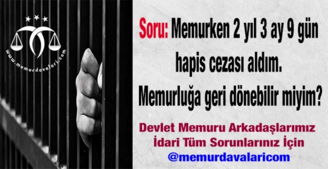 Soru: Bir devlet kurumunda memur olarak çalışmaktayken kasten yaralama suçundan 2 yıl 3 ay 9 gün hapis cezası ile cezalandırıldım. Mahkemece; infazım Denetimli Serbestlik Müdürlüğü gözetiminde tamamlanıncaya kadar kamu görevini üstlenmekten yoksun bırakılmama karar verildi. 20.03.2020 itibariyle de infazımı tamamladım. Eski görevime geri dönebilir miyim? Yardımcı olursanız sevinirim.