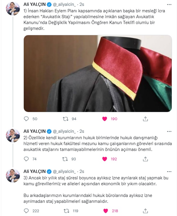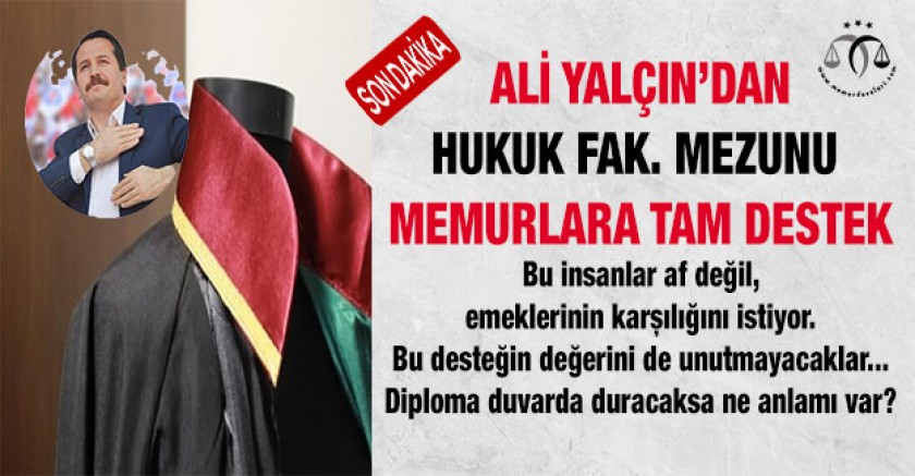 Şimdi ise Memur Sen Genel Başkanı Ali Yalçın desteğini açıkladı. TBMM'de komisyonda şuan görüşülen teklifin beklentiyi karşılamadığını ve kamu çalışanları adına revize edilmesi gerektiğini belirten Genel Başkan Ali Yalçın paylaşımlarını twitter üzerinden yayınladı. Hukuk Fakültesi mezunu memurlarımızın gözü şuan TBMM'de... Bilindiği gibi bu insanlar Bu insanlar; haksızlığın meşrulaştırılmasını, af, usul düzenlemesi gibi bir düzenlemede değil sadece ve sadece çalışarak, alın teri dökerek elde ettikleri diplomalarının bir işe yaradığını göremek istiyor.