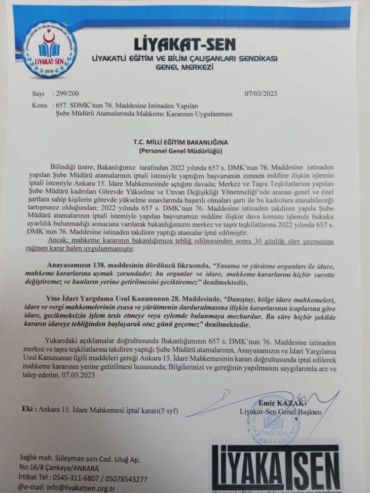 Milli Eğitim Bakanı Mahmut ÖZER tarafından 2022 yılında 657 s. DMK’nın 76. Maddesine istinaden yapılan sınavsız Şube Müdürü atamalarının iptali istemiyle yaptığım başvurunun zımnen reddine ilişkin işlemin iptali istemiyle Ankara 15. İdare Mahkemesinde açtığım davada; Merkez ve Taşra Teşkilatlarına yapılan Şube Müdürü kadroları Görevde Yükselme ve Unvan Değişikliği Yönetmeliği’nde aranan genel ve özel şartlara sahip kişilerin görevde yükselme sınavlarında başarılı olmaları şartı ile bu kadrolara atanabileceği tartışmasız olduğundan; 2022 yılında 657 s. DMK’nın 76. Maddesine dayanarak yapıla Şube Müdürü atamalarının iptali istemiyle yapılan başvurumun reddine ilişkin dava konusu işlemde hukuka uyarlılık bulunmadığı sonucuna varılarak bakanlığımızın merkez ve taşra teşkilatlarına 2022 yılında 657 s. DMK’nın 76. Maddesine göre yaptığı atamalar iptal edilmiştir.