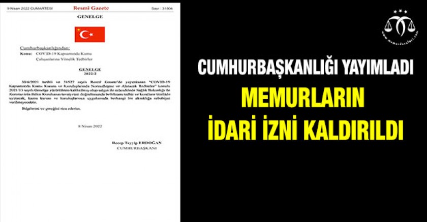 9 Nisan 2022 tarihli Resmi Gazete’de yayımlanan genelge ile kronik hastalığı bulunan 60 yaş üstüne verilen idari izinler ile gebelikte 24.haftada başlatılan doğum öncesi izin uygulaması kaldırıldı. Böylelikle hamile ve kronik hastalığı olanlara idari izin hakkını içeren genelge yürürlükten kaldırılmış oldu.