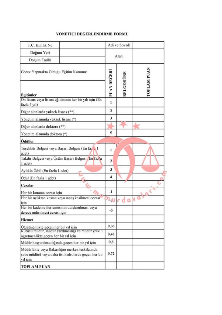 MEB yönetici atama yönetmeliği taslağında sadece yönetici değerlendirme yönetmeliği ek-1 form hazırlandı. Bu form ile sadece mevcut yöneticilerin yer değişikliği yapılacak.