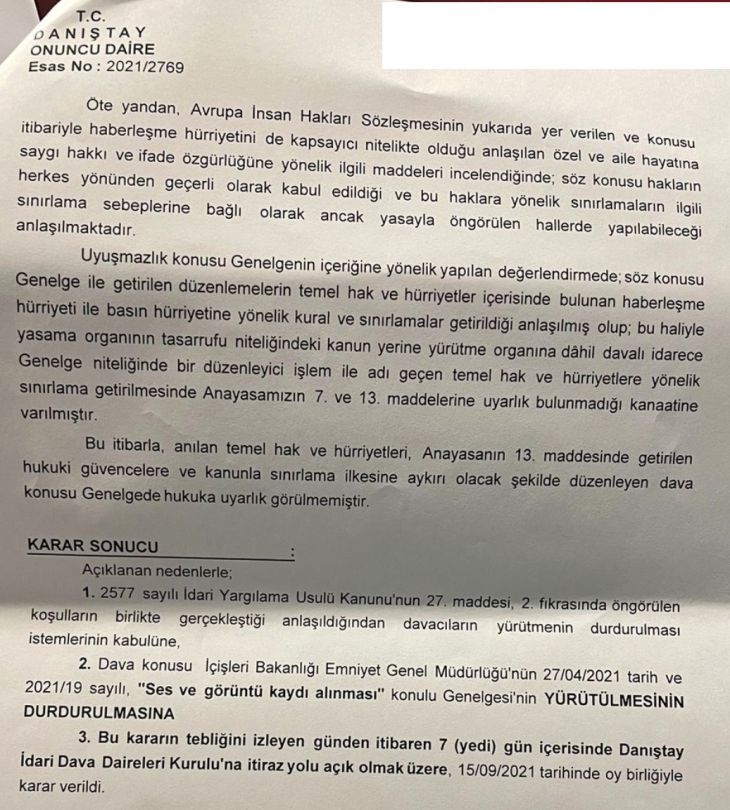 Kararda, söz konusu genelgenin haberleşme ve basın hürriyetini kısıtladığı vurgulanarak, temel hak ve hürriyetlerin sadece kanunla sınırlandırılabileceği belirtildi.