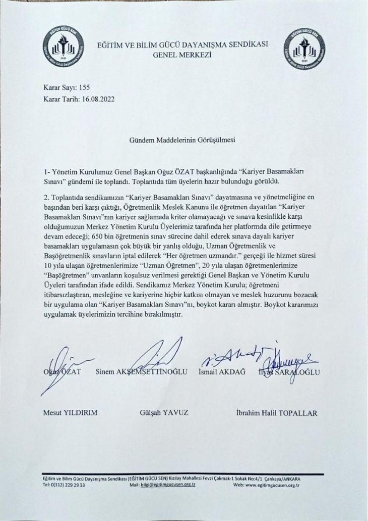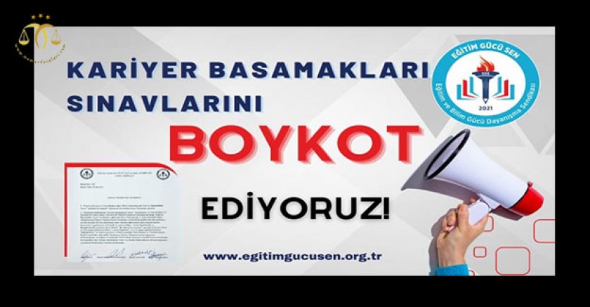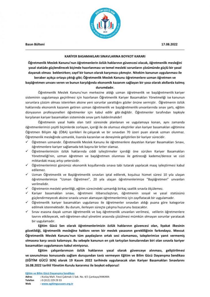 Eğitim çalışanlarımızın özlük haklarının yasal olarak güvenceye alınması, geliştirilmesi ve savunulması konusunda sağlam duruşundan taviz vermeyen Eğitim ve Bilim Gücü Dayanışma Sendikası (EĞİTİM GÜCÜ SEN) olarak 19 Kasım 2022 tarihinde uygulanacak olan Kariyer Basamakları Sınavlarını 16.08.2022 tarihli Yönetim Kurulu kararımız ile boykot ediyoruz!