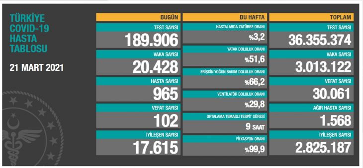 Türkiye'de son 24 saatte 189 bin 906 Kovid-19 testi yapıldı, 20 bin 428 kişinin Kovid-19 testi pozitif çıktı, 102 kişi hayatını kaybetti.