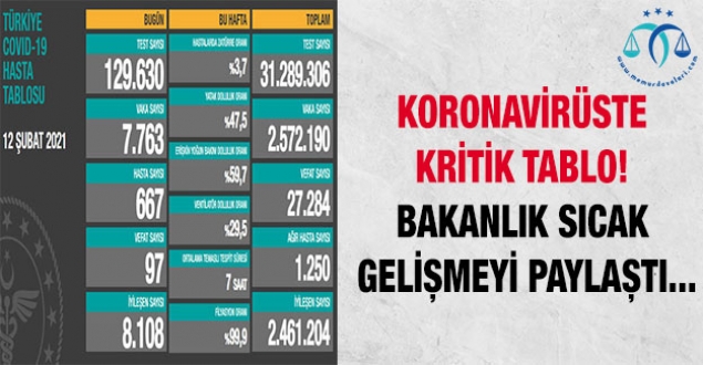 Buna göre, son 24 saatte 129 bin 630 Kovid-19 testi yapıldı, 7 bin 763 kişinin testi pozitif çıktı, 97 kişi hayatını kaybetti, hasta sayısı 667 oldu.