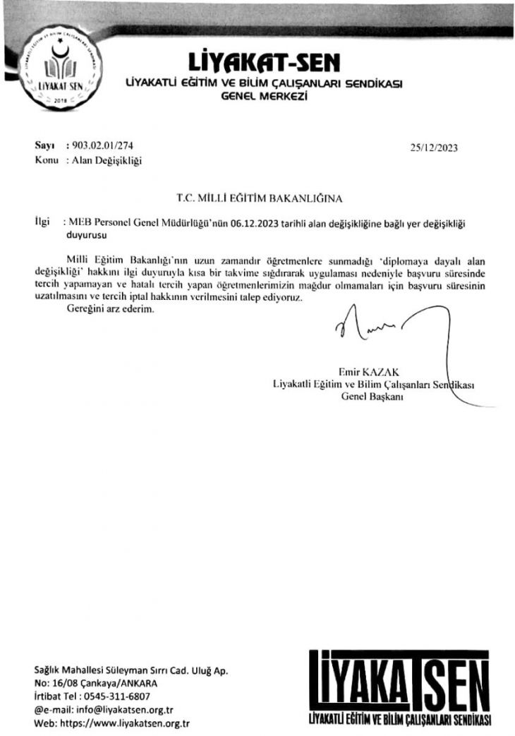 Milli Eğitim Bakanlığı’nın uzun zamandır öğretmenlere sunmadığı ‘diplomaya dayalı alan değişikliği’ hakkını MEB Personel Genel Müdürlüğü’nün 06.12.2023 tarihli alan değişikliğine bağlı yer değişikliği duyurusuyla kısa bir takvime sığdırarak uygulaması nedeniyle başvuru süresinde tercih yapamayan ve hatalı tercih yapan öğretmenlerimizin mağdur olmamaları için başvuru süresinin uzatılmasını ve tercih iptal hakkının verilmesini talep ediyoruz.