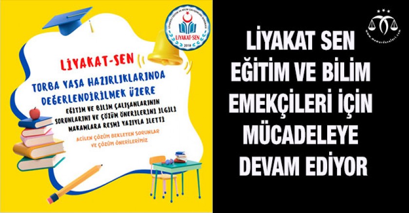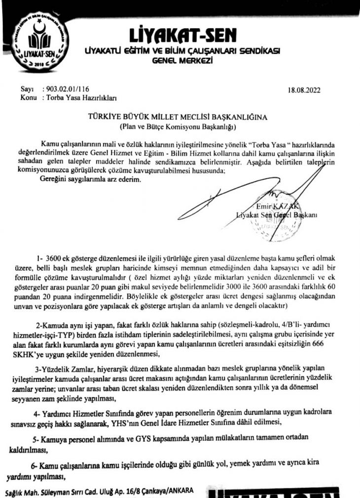 Liyakatli Eğitim ve Bilim Çalışanları Sendikası  olarak; Ekim ayında gündeme gelmesi beklenen; Kamu çalışanlarının mali ve özlük haklarının iyileştirilmesine yönelik “Torba Yasa" hazırlıklarında değerlendirilmek üzere Genel Hizmet ve Eğitim - Bilim Hizmet kollarına dâhil kamu çalışanlarına ilişkin sahadan gelen talepler maddeler halinde sendikamızca belirlenmiştir.