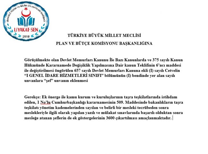 Hal böyle iken Mecliste görüşülmekte olan Devlet Memurları Kanunu ile bazı kanunlarda ve 375 sayılı Kanun Hükmünde Kararnamede Değişiklik Yapılmasına Dair Kanun Teklifinin 6. Maddesinde “Genel İdare Hizmetleri Sınıfına ” haiz tüm yöneticiler ve bazı alt meslek grupları 3600 ek göstergeden yararlanırken, 1 Nolu Cumhurbaşkanlığı kararnamesine göre taşra teşkilatı yöneticilerinden sayılan “Şefler” yine bu iyileştirici düzenlemelerden yararlanamamıştır.