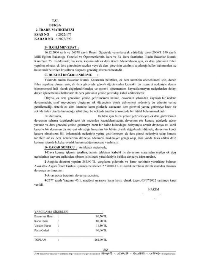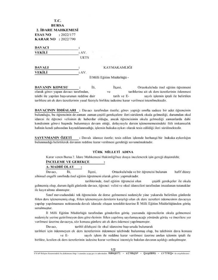Bursa 2. İdare Mahkemesi, kararında şu ifadelere yer verdi: “…Olayda, ek ders görevinin yerine getirilmemesi halinin, davacının şahsından kaynaklı bir nedene dayanmadığı, sınıf mevcudunu oluşturan tek öğrencinin okula gelmemesi nedeniyle bu görevin yerine getirilemediği, üstelik ek ders istemine konu günlerde davacının ders görevini yerine getirmeye hazır bir şekilde fiilen okulda bulunduğu sabit olup, bu noktada taraflar arasında da bir ihtilaf bulunmamaktadır. Bu durumda, 23.11.2021 ve 26.11.2021 tarihleri için fiilen yerine getirilemeyen ek ders görevlerinin davacının şahsına özgülenebilecek bir nedenden kaynaklanmadığı, davacının söz konusu günlerde görev yerinde ve ders görevini yerine getirmeye hazır bir halde bulunduğu, dolayısıyla ortada davacıya atfı kabil kusurlu bir durumun da mevcut olmadığı hususları bir bütün olarak değerlendirildiğinde, davacının kendi kusuru olmaksızın fiili imkânsızlık nedeniyle yerine getirilemeyen ek ders görevi nedeniyle talep konusu tarihlere ait ek ders ücretlerinin davacıya ödenmesi hakkaniyet gereği olup, aksi yönde tesis edilen dava konusu işlemde hukuka uyarlık bulunmadığı sonucuna varılmıştır.”