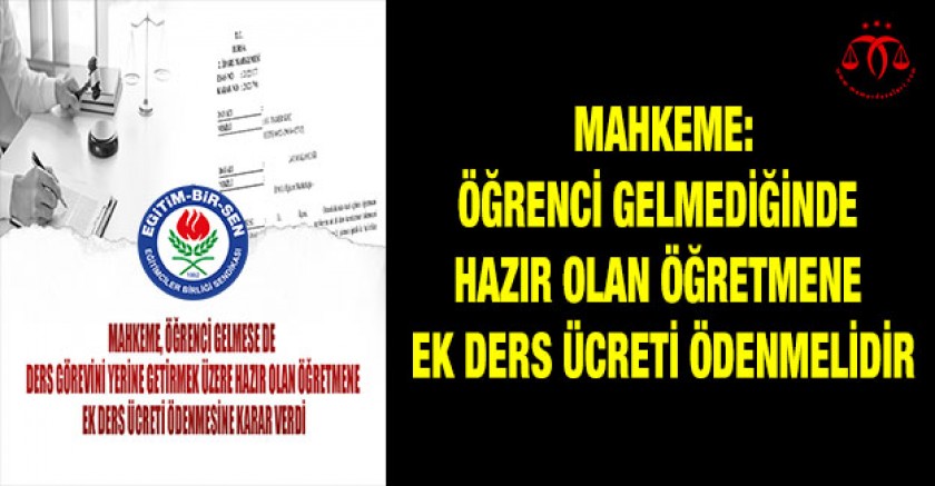 Eğitim-Bir-Sen olarak, özel eğitim öğretmeni üyemizin öğrencinin okula gelmediği döneme ait ek ders ücretlerinin ödenmesi talebinin reddine ilişkin işlemin iptali için açmış olduğumuz davada, mahkeme, üyemizin kendi kusuru olmaksızın fiili imkânsızlık nedeniyle ek ders görevinin yerine getirilemediği gerekçesiyle, talep edilen ek ders ücretlerinin ödenmesi gerektiğine hükmetti.