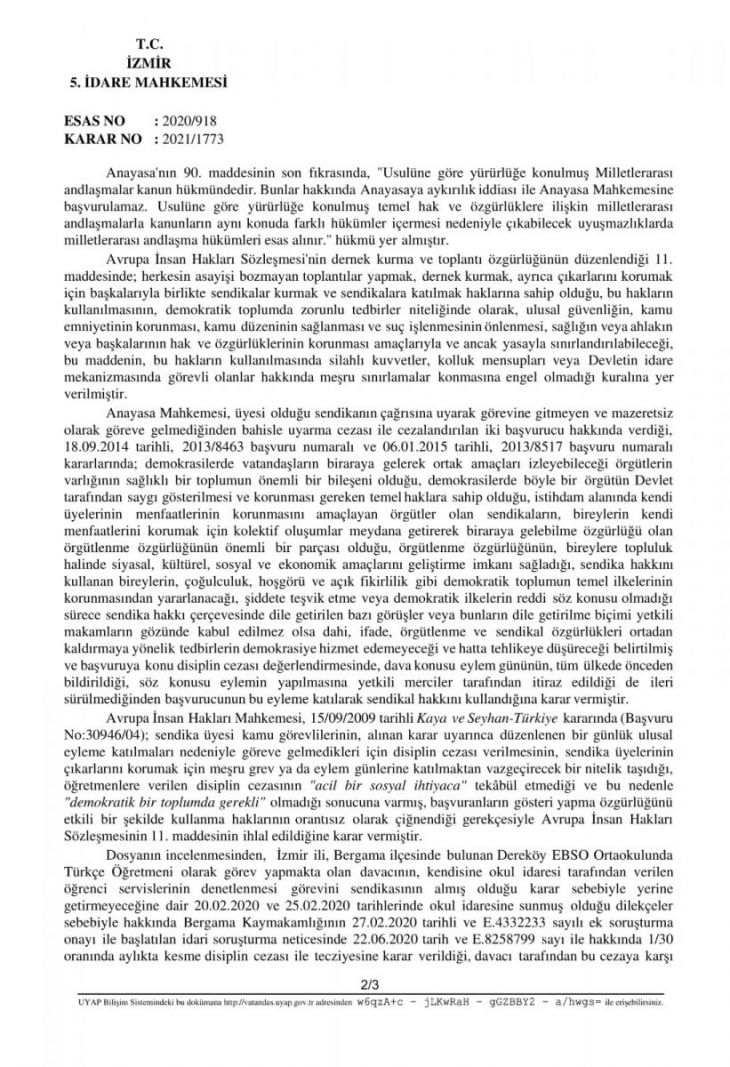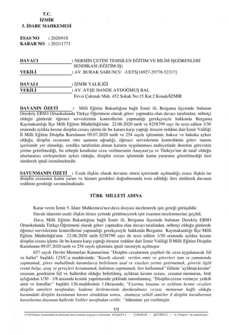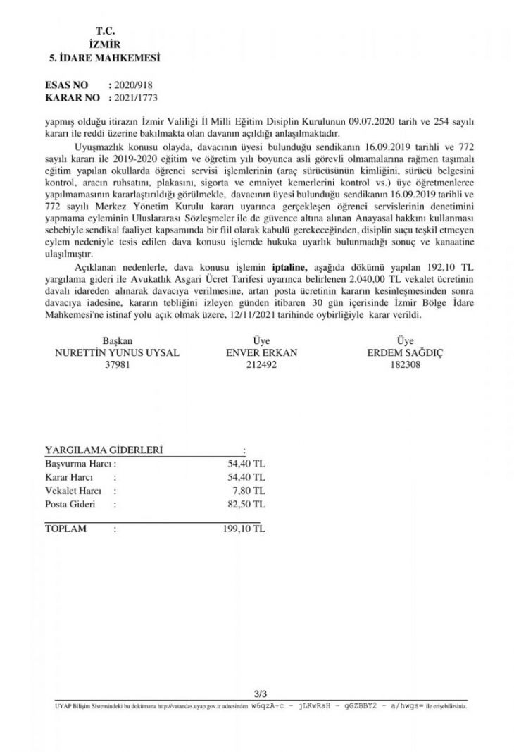 Yani kamuoyuna yansıdığı gibi nöbetçi öğretmene verilen okul servis araçlarını kontrol etme görevinin hukuka aykırılığı nedeniyle iptal edilmiş bir mahkeme kararı bulunmamaktadır. Aksine mahkeme kararında da açık bir şekilde belirtildiği üzere, bu konuda sendikasının almış olduğu eylem kararına uyarak verilen disiplin cezasının iptal edilmesi söz konusudur.