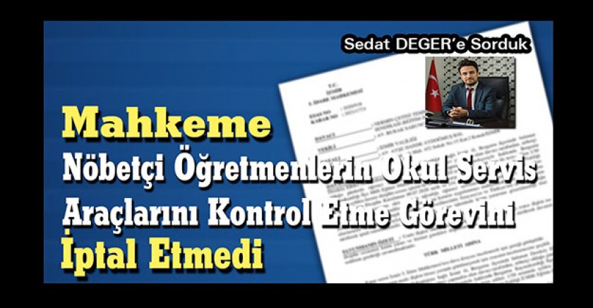 Geçen haftalarda kamuoyuna yansıyan mahkeme kararı sonucunda kafalarda soru işaretinin kalması üzerine eğitimci yazar Sedat DEGER’e sorduk. DEGER, mahkeme kararının aslında kamuoyuna yansıtıldığı gibi nöbetçi öğretmenlere okul servis araçlarını kontrol etme görevini iptal etmesi gibi bir durumun olmadığını ifade ederek mahkeme kararına açıklık getirdi.