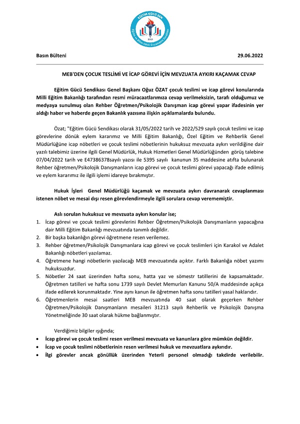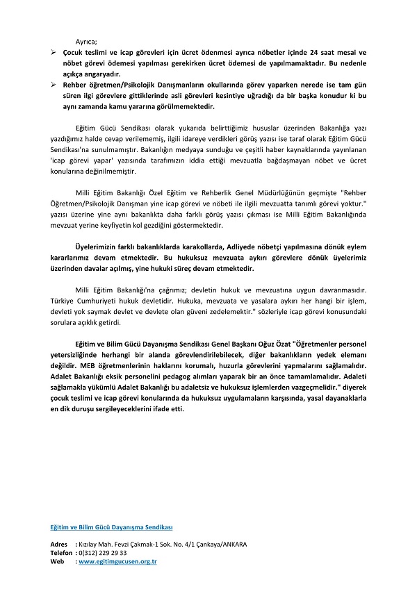 Özat; "Eğitim Gücü Sendikası olarak Bakanlığa yazı yazdığımız halde cevap verilememiş, ilgili idareye verdikleri görüş yazısı ise taraf olarak Eğitim Gücü Sendikası'na sunulmamıştır. Bakanlığın medyaya sunduğu ve tarafınızın da yayınladığı 'icap görevi yapar' yazısında tarafımızın iddia ettiği mevzuatla bağdaşmayan nöbet ve ücret konularına değinilmemiştir.