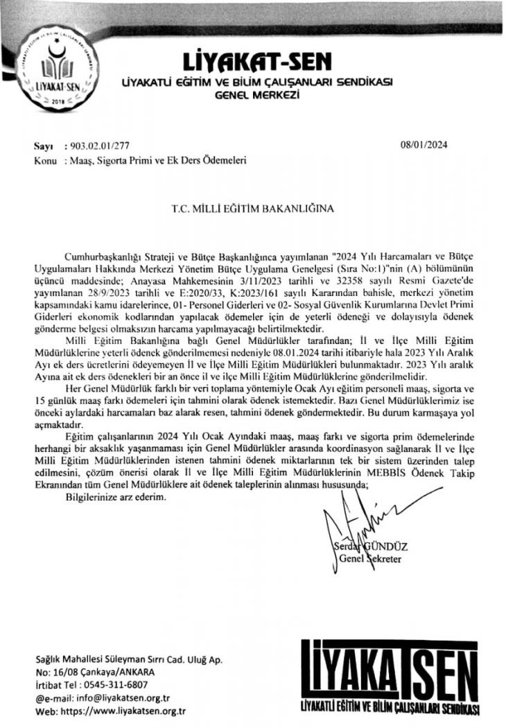 Liyakatli Eğitim ve Bilim Çalışanları Sendikası Genel Merkez Yönetim Kurulu olarak 08.01.2024 tarihli ve 903.02.01/277 sayılı yazımız ile Eğitim çalışanlarının maaş, maaş farkı ve sigorta prim ödemelerinde herhangi bir aksaklık yaşanmaması için Genel Müdürlükler arasında koordinasyon sağlanarak İl ve İlçe Milli Eğitim Müdürlüklerinden istenen tahmini ödenek miktarlarının tek bir sistem üzerinden talep edilmesini, çözüm önerisi olarak İl ve İlçe Milli Eğitim Müdürlüklerinin MEBBİS Ödenek Takip Ekranından tüm Genel Müdürlüklere ait ödenek taleplerinin alınmasını Milli Eğitim Bakanlığından talep etmiştik.