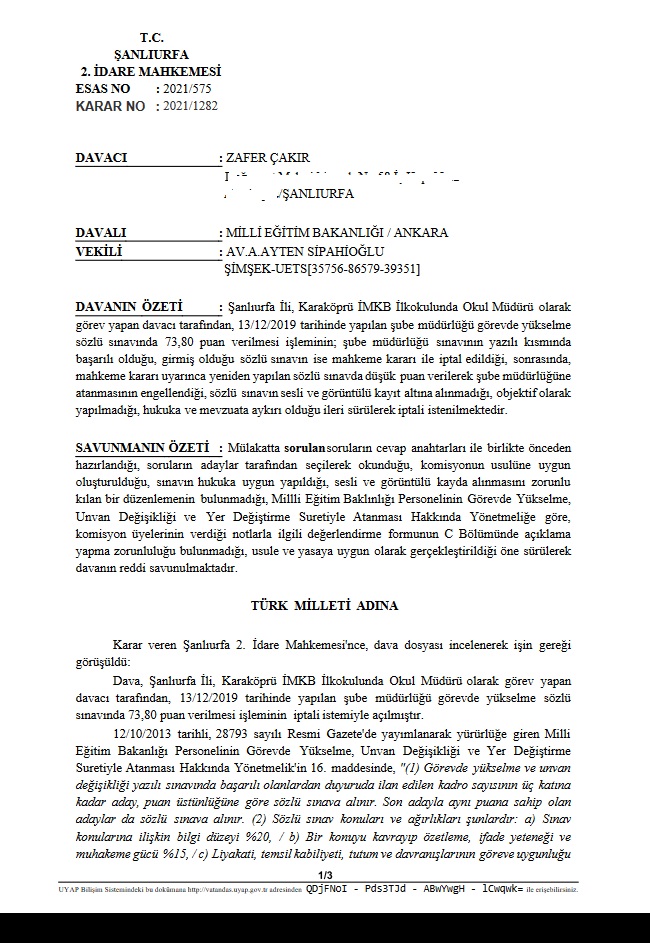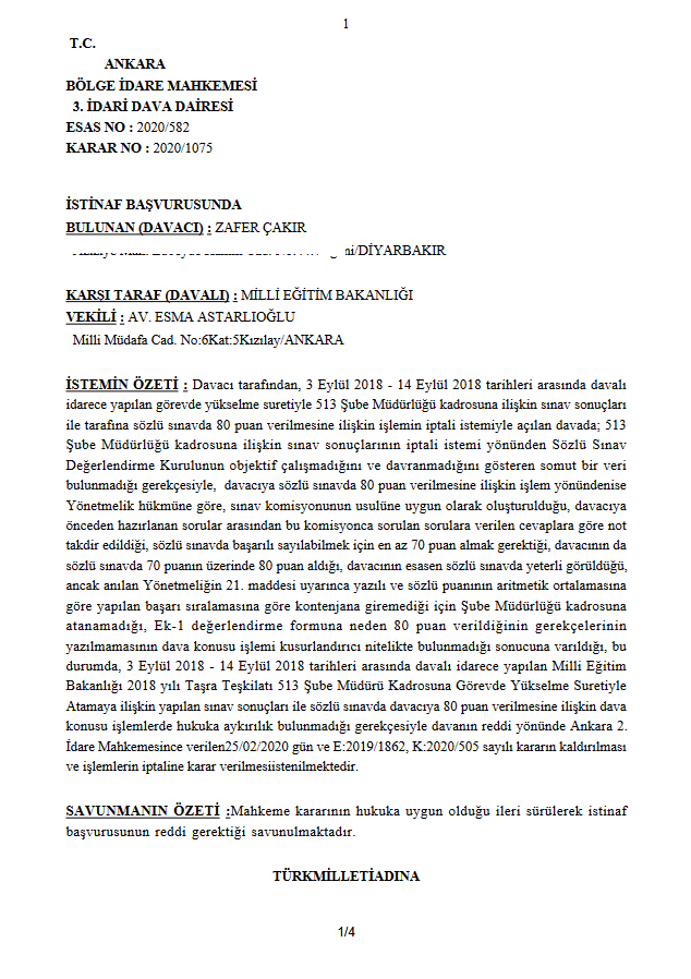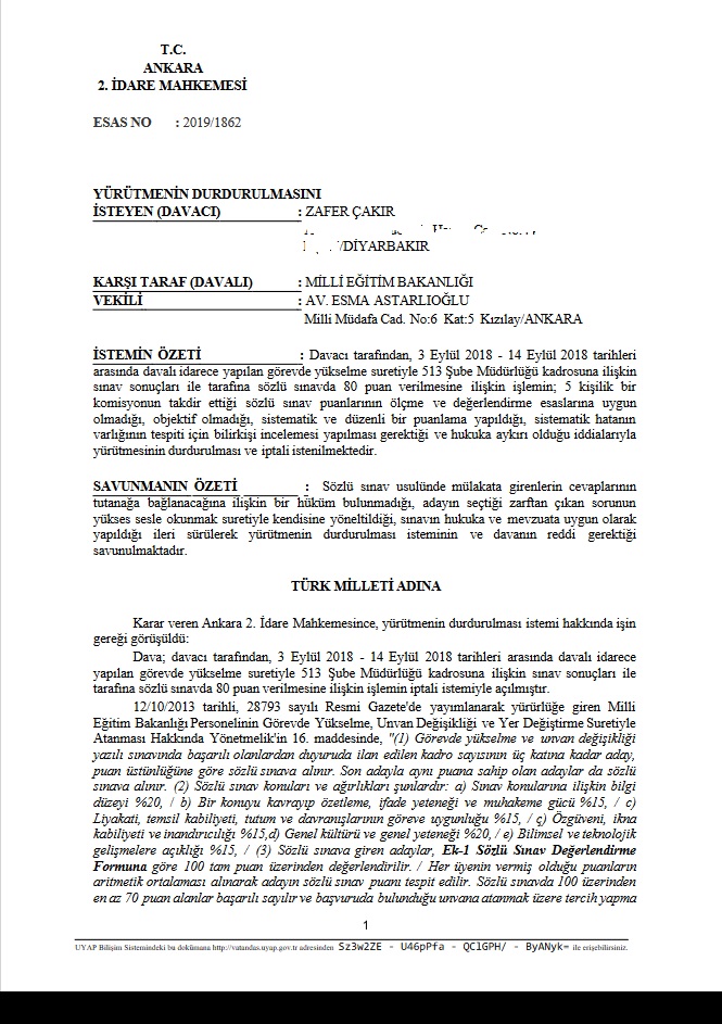 Milli Eğitim Bakanlığı 2018 yılı 513 Şube Müdürlüğü için yazılı sınavdan 89,82 puan alarak mülakata giren Liyakat-Sen Diyarbakır İl Temsilcimiz Zafer ÇAKIR, sözlü sınavda düşük puan verilerek kontenjan dışı bırakıldı. Bunun üzerine sözlü sınav işleminin iptali için açılan davada Ankara 2.İdare Mahkemesi Yürütmeyi durdurma kararı verdi.