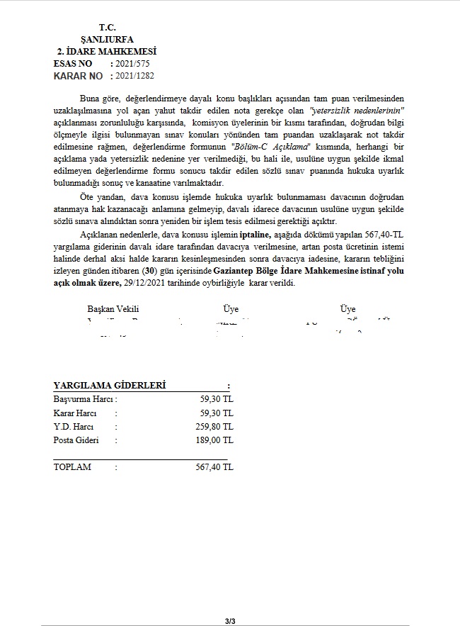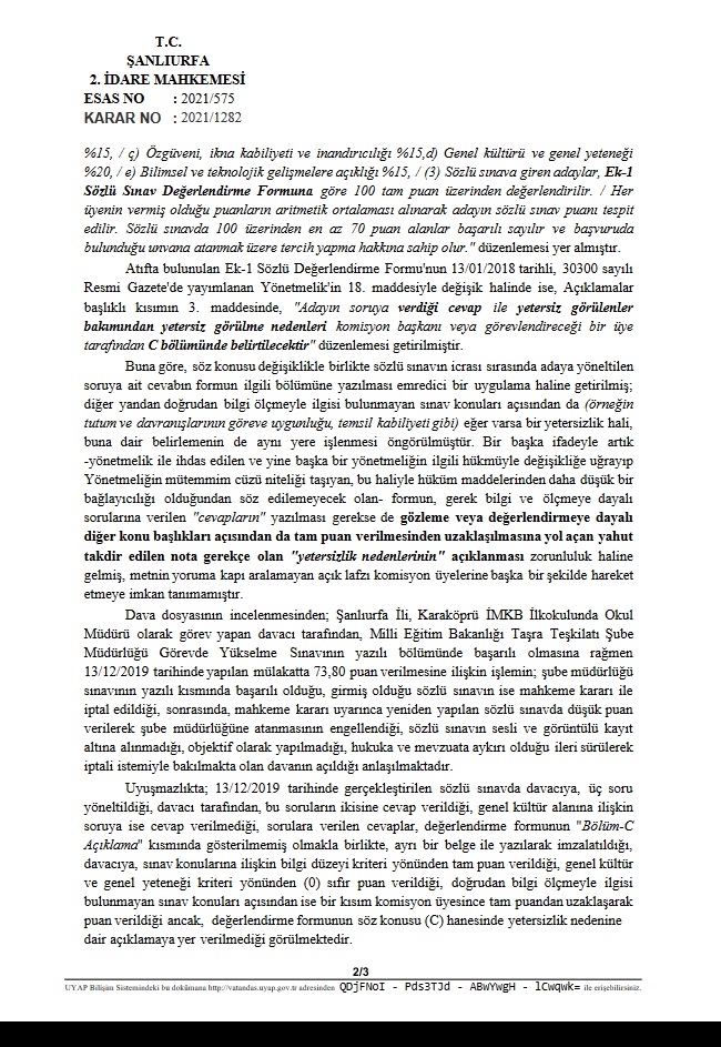 13.12.2019 tarihinde yargı kararıyla 2.defa yenilenen sınavda daha düşük puan verilerek yine kontenjan dışı bırakıldı.2.defa verilen düşük mülakat puanına 2.defa yargı freni geldi. Şanlıurfa 2.İdare Mahkemesi 29/12/2021 tarihinde iptal etti.16/02/2022 tarihinde yargı kararı ile 3.kez yenilenen mülakatta mülakat puanı yine düşürüldü.