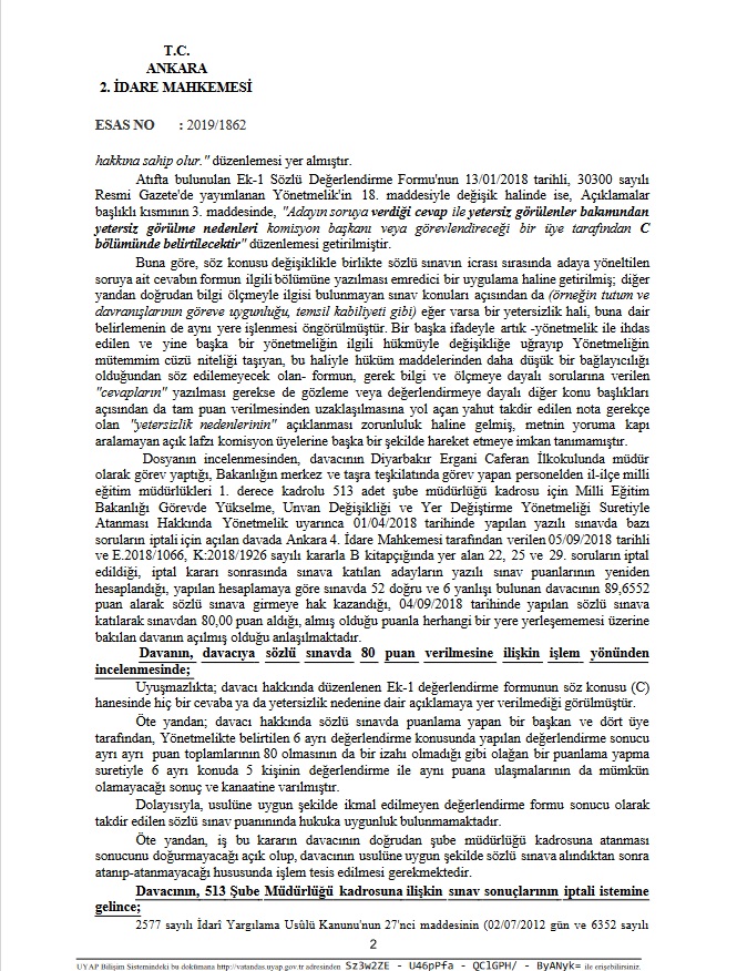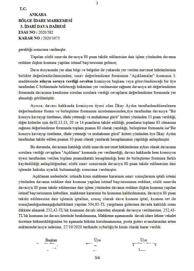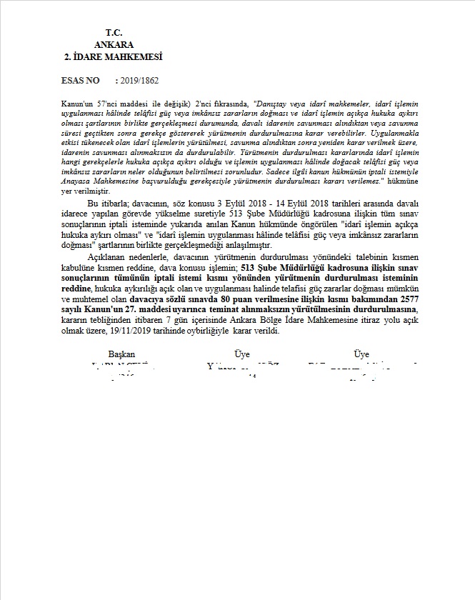 Mahkeme, 19 Kasım 2019'da aldığı kararda yürütmeyi durdurmanın sebebi şöyle açıklandı: Uyuşmazlıkta; davacı hakkında düzenlenen Ek-1 değerlendirme formunun söz konusu (C) hanesinde hiç bir cevaba ya da yetersizlik nedenine dair açıklamaya yer verilmediği görülmüştür. Öte yandan; davacı hakkında sözlü sınavda puanlama yapan bir başkan ve dört üye tarafından, Yönetmelikte belirtilen 6 ayrı değerlendirme konusunda yapılan değerlendirme sonucu ayrı ayrı puan toplamlarının 80 olmasının da bir izahı olmadığı gibi olağan bir puanlama yapma suretiyle 6 ayrı konuda 5 kişinin değerlendirme ile aynı puana ulaşmalarının da mümkün olamayacağı sonuç ve kanaatine varılmıştır.